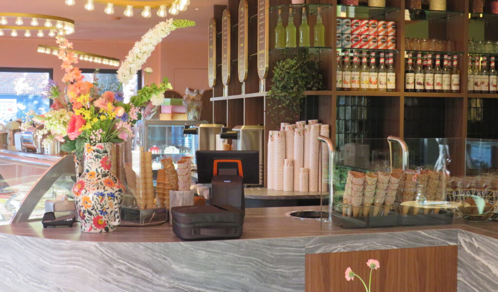 Net buiten de keuken en dus in de nieuwe ijssalon staat de zeer authentieke bokvriezer waar haar opa en vader ook mee draaide. Met deze machine wordt nog regelmatig de heerlijkste ijs gedraaid. Letterlijk gedraaid, want hier komen echt de armen bij aan te pas. “Wanneer je iedere dag alleen maar met deze machine werkt, hoef je echt niet meer naar de fitness. In ieder geval niet meer voor je armspieren” grapt Daan.