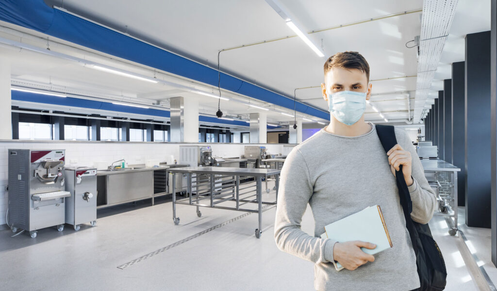 Dus ook binnen het IJscentrum maakt het mondkapje een comeback. Waar men zich voortbeweegt, draagt men een mondkapje. Omdat we ondanks het ruim opgezette praktijklokaal niet kunnen garanderen dat we een onderlinge afstand van 1,5 meter kunnen waarborgen, vragen we onze cursisten om ook tijdens de les een mondkapje te dragen. IJscentrum verstrekt deze kostenloos.